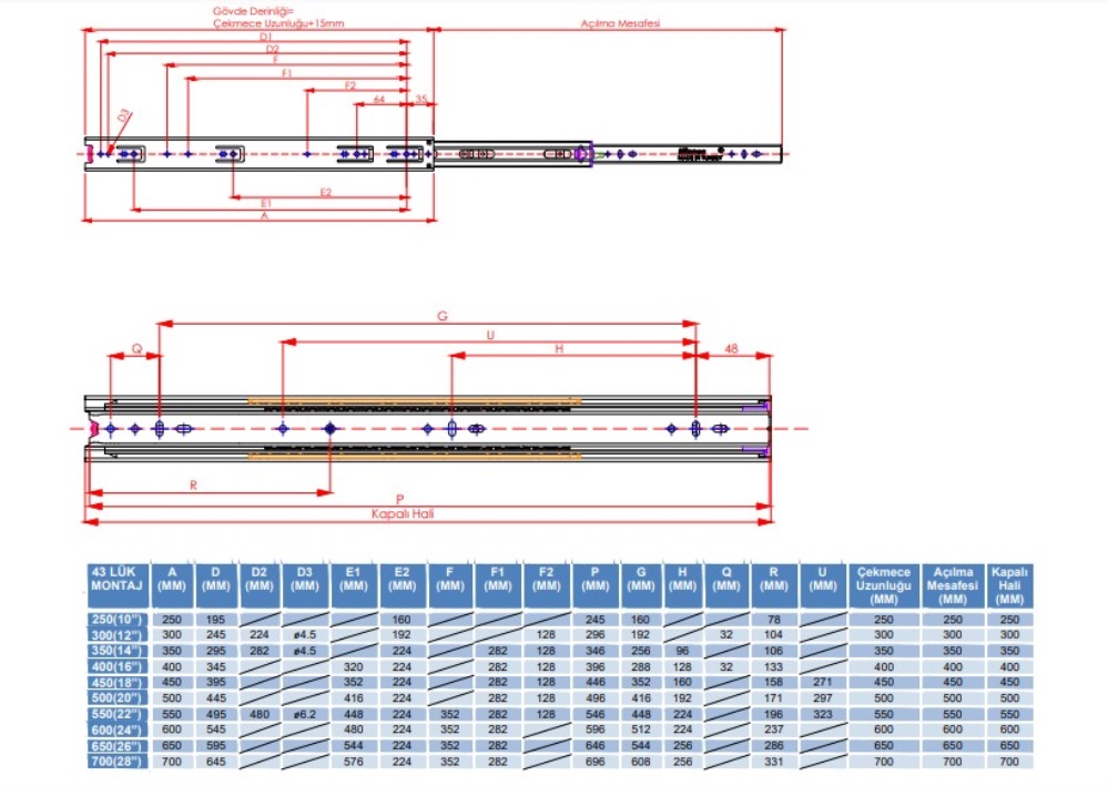 MİNNES 43 mm TELESKOPİK RAY ÜRÜN BİLGİLERİ-